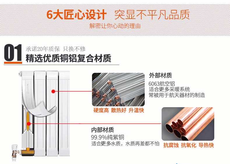 草莓视频污片铜铝复合列宾系列暖气片草莓污视频在线免费观看,独特的防熏墙设计,有效的减轻墙面的熏黄与熏黑;材料升级,内腔铜管采用“冷轧拉伸紫铜管”,新型高强度紫铜管,目前只有草莓视频污片在使用;冷轧拉伸紫铜管+铝镁合金,散热量超大,适合任何供暖系统,一辈子不用更换;表面经过20道工序处理,外喷涂采用美国立邦粉末涂料,亮光度达98%,永恒经典的外观设计,可与任何装饰风格匹配;该款产品设计使用寿命五十年,出厂前均在21公斤压力环境下试压四次,保证产品无论任何情况下都不会爆裂,三十年内,若因质量问题漏水,一律换新,免除后顾之忧!